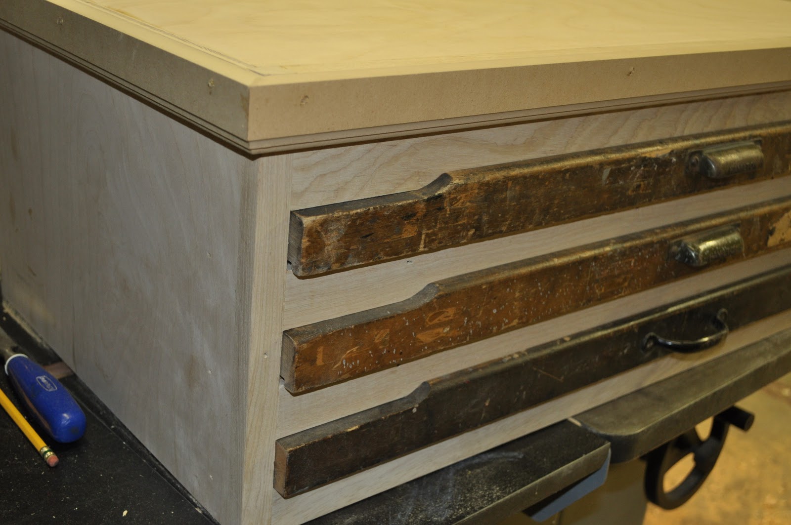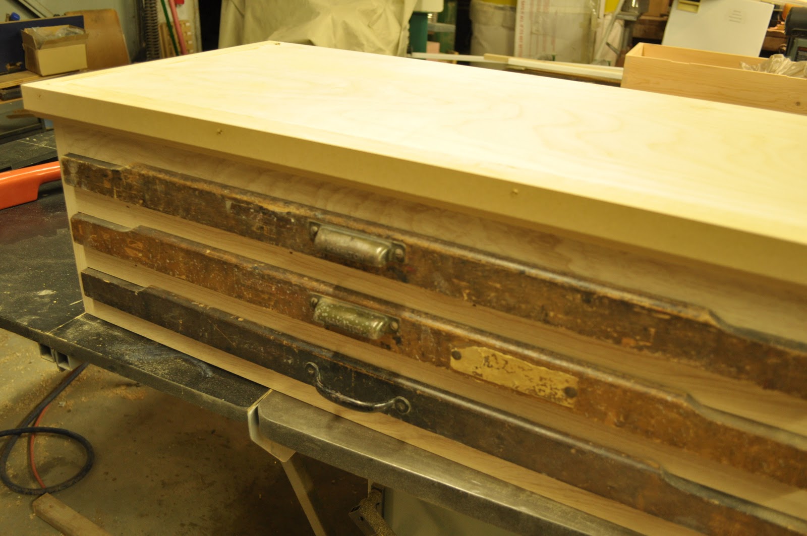 Now you can see why we left such a large space at the top of the cabinet. Above the top drawer was taller than between the other drawers so that it would be more substantial. It is going to sit on top of the library card catalog and I wanted it to have more of a statement moulding so it looked the top of the piece. The routered edge is matched to the library card catalog routered top edge so that they are going to be able to become one piece.